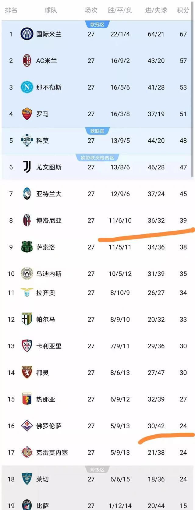本轮赛事全部结束后,意甲积分榜格局彻底清晰,国际米兰以67分高居榜首,领先第二名AC米兰10分,夺冠优势十分明显。中游球队的欧战资格争夺愈发激烈,保级区更是陷入多队混战的局面,积分差距微弱让每一场比赛都至关重要。